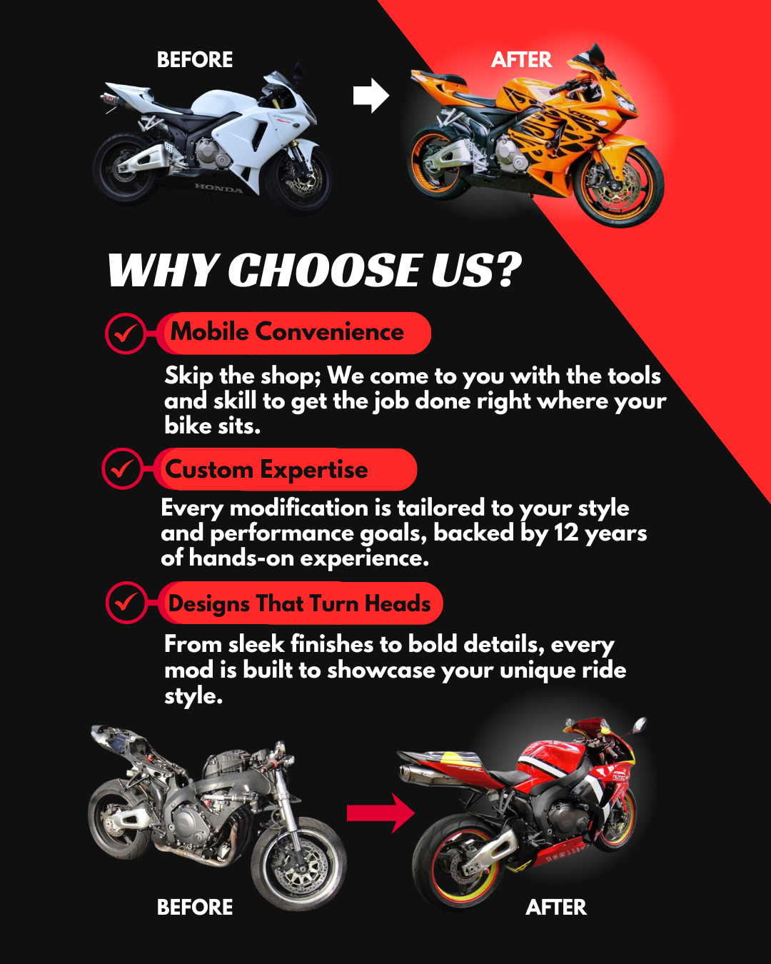 Whether it’s a full fairing, half fairing, or custom design, we’ll ensure a precise fit and flawless finish that complements your bike’s style.